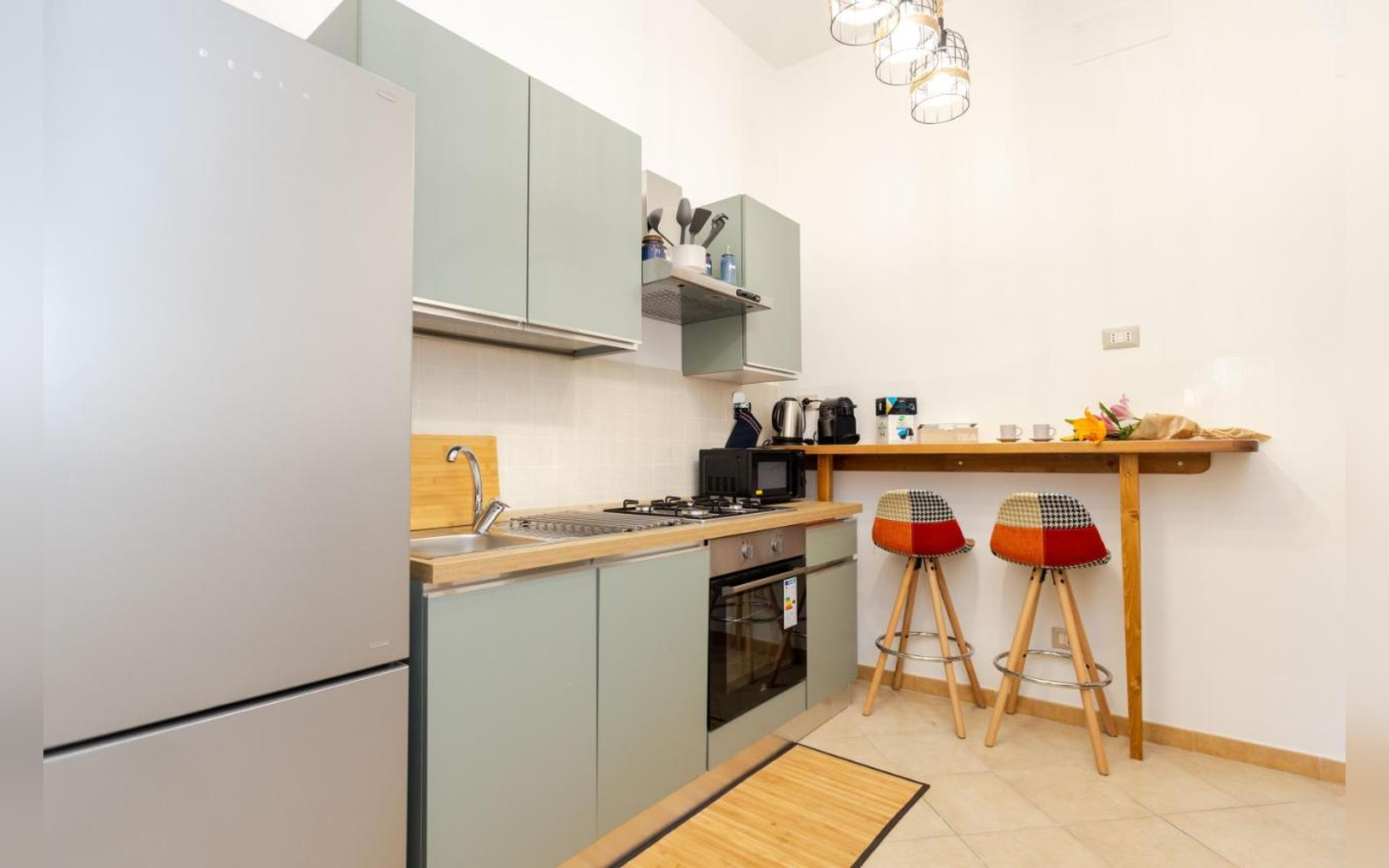 Dotata di piano cottura, frigorifero, microonde, macchina del caffè e utensili.